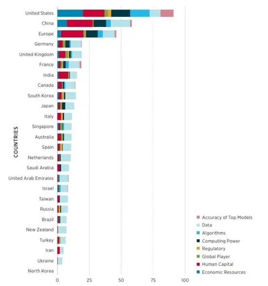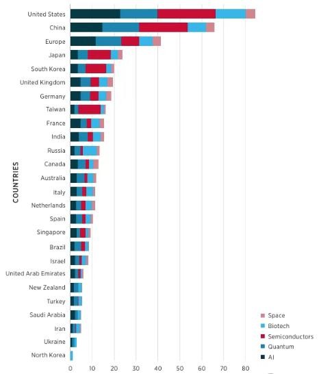 这份长达七十余页的报告,对全球25个主要国家在人工智能、生物技术、半导体、太空和量子技术这五大核心战场上的综合实力进行了精准量化评估,呈现出一幅中美双雄争霸、欧洲奋力追赶的全球科技新版图。